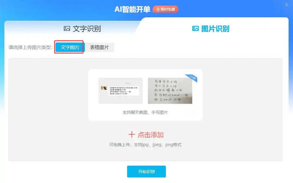 支持的类型:文字图片、表格图片图片格式:支持jpg、jpeg、png格式